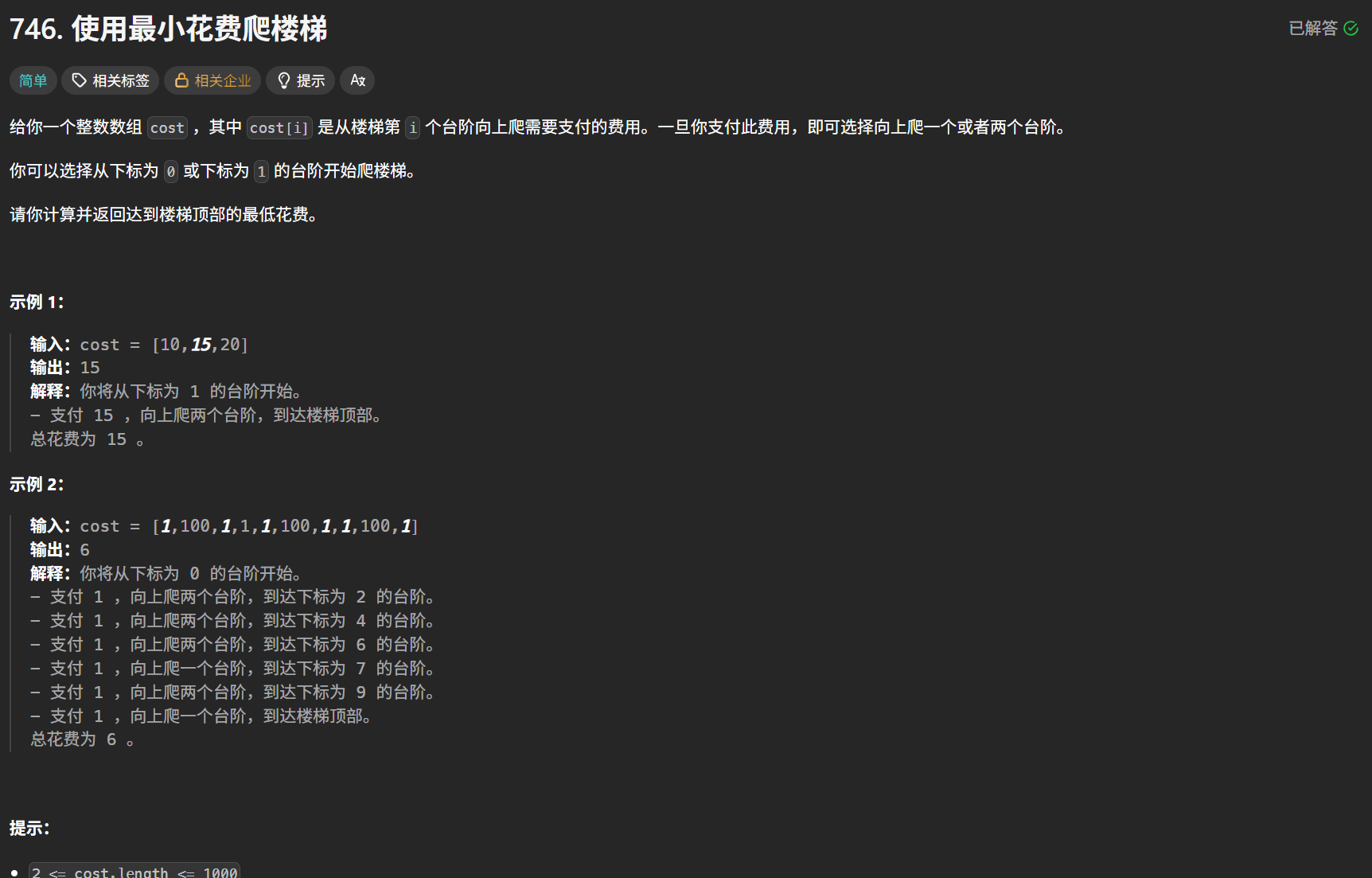 题目的意思在于爬到 c o s t . l e n g t h 的位置,需要花费多少,仅仅是爬到 c o s t . l e n g t h − 1 是不能直接到达终点的,还需要花费该位置的 数字 。