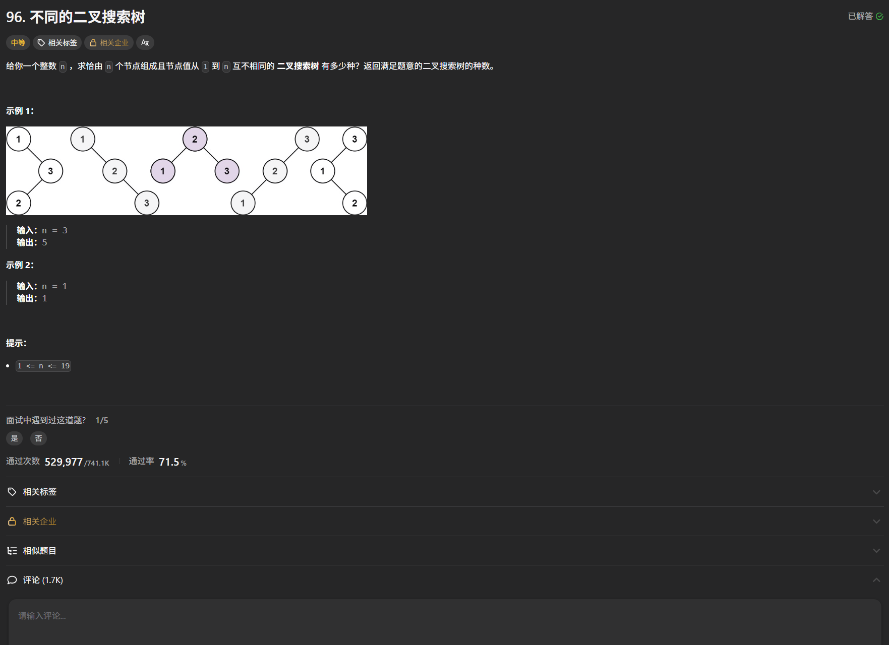 - 以某个 i为根节点的个数 = 其左子树存在的个数 * 右子树存在可能的个数(其实我们应该能想到,当固定某一整个大的部分不变时,讨论某个小部分不变的话,就可以找到所有的子树。
