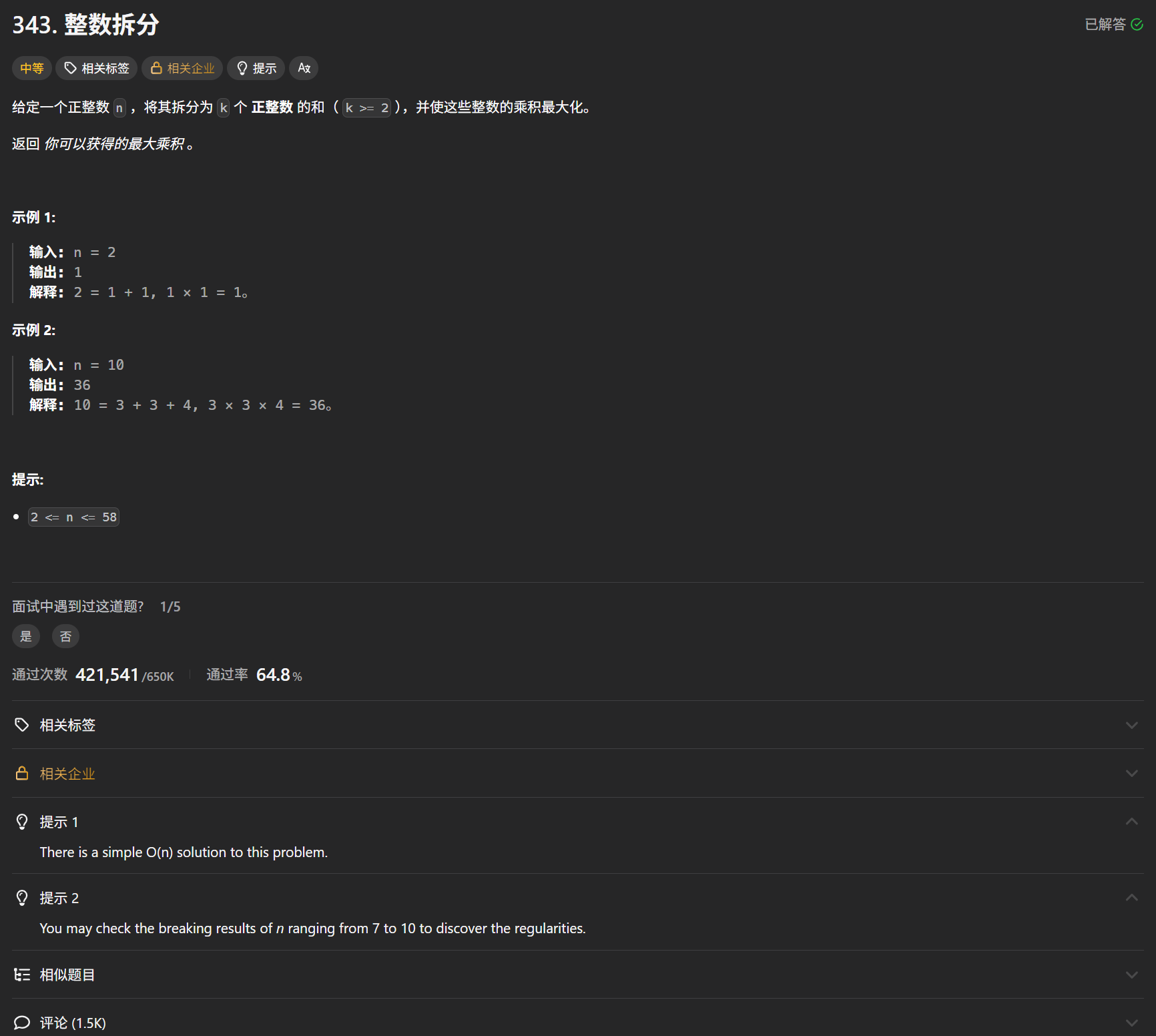 2. res[n] 可以取得的最大效果实际上就是 :1. 当前保存的最大值; 2. 当前进行拆分的结果 res[i] * (n - i) ; 3. 当前不进行差分得到的最终结果 i * (n – i)*