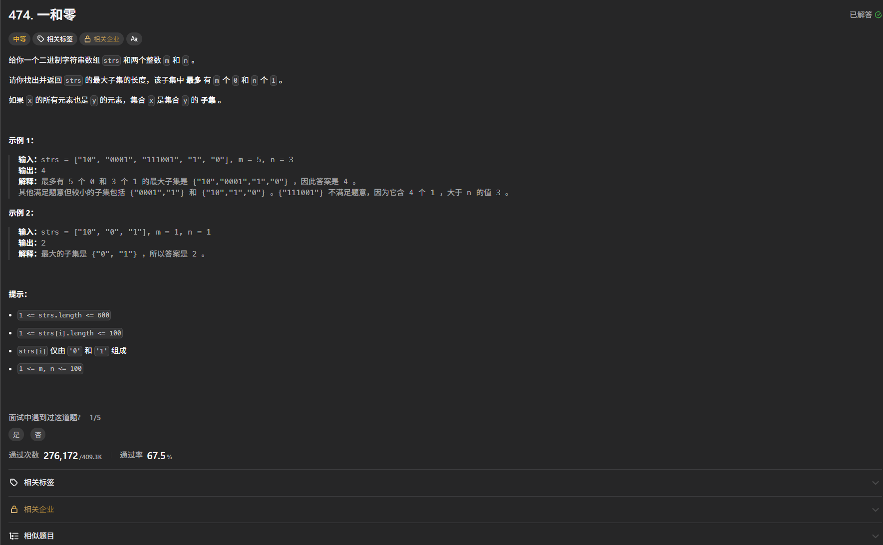 str的zeroNum和oneNum的个数,所以呢我们可以定义一个内部类,但是也可以不用定义直接将处理的过程添加到计算str的内层循环中; - 类似于[[16. 目标和]], 我们这里需要装满的是