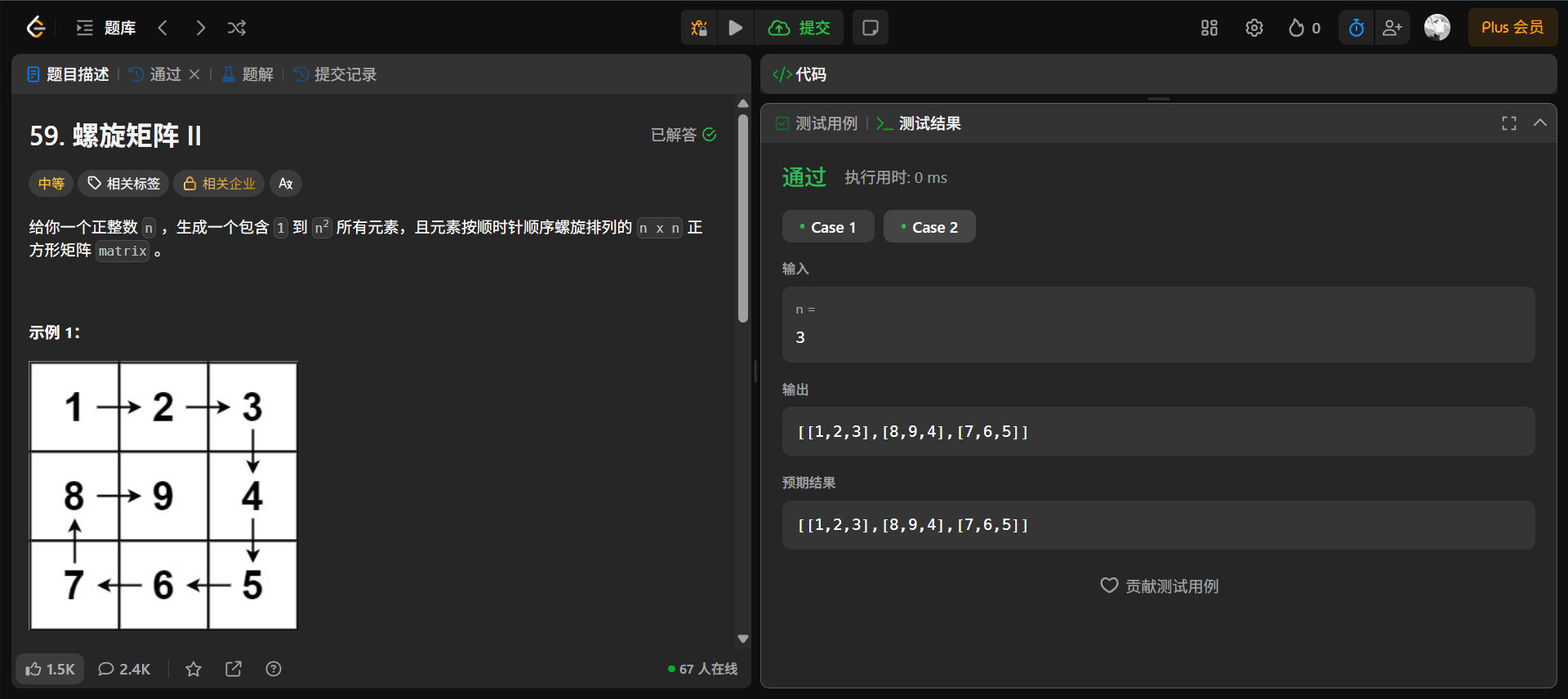 - 时间复杂度: O(n^2)。生成矩阵需要遍历 n^2 个元素,每个元素都被访问一次。