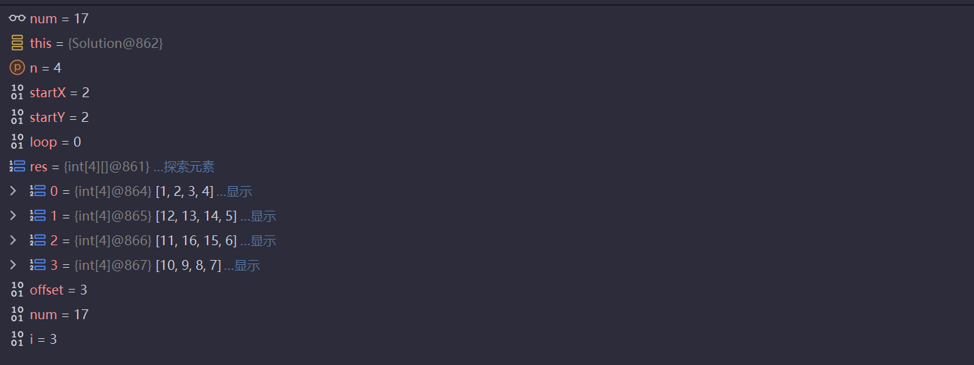 vector<vector<int>> res = s.generateMatrix(n);