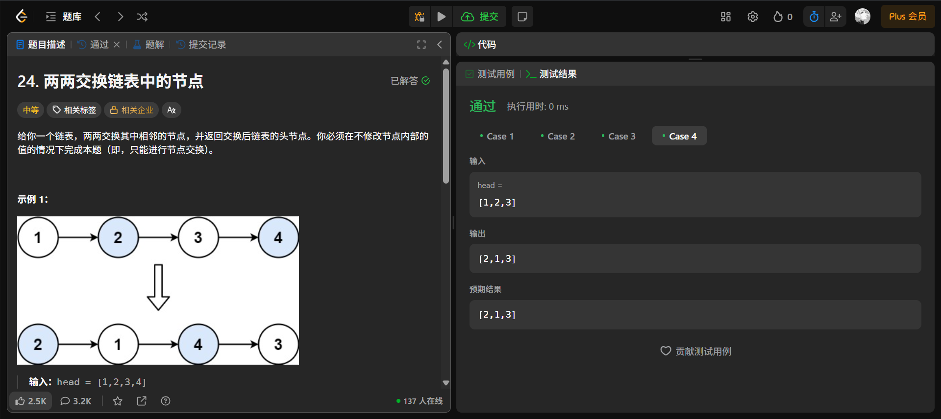 给定一个链表,两两交换其中相邻的节点,并返回交换后链表的头节点,在不改变节点内部值的情况下完成。