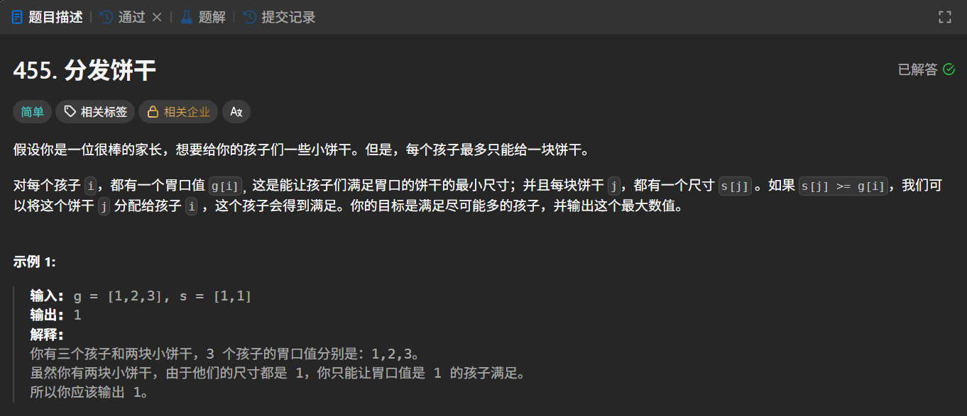 对每个孩子 i,都有一个胃口值 g[i],这是能让孩子们满足胃口的饼干的最小尺寸;并且每块饼干 j,都有一个尺寸 s[j] 。如果 s[j] >= g[i],我们可以将这个饼干 j 分配给孩子 i ,这个孩子会得到满足。你的目标是尽可能满足越多数量的孩子,并输出这个最大数值。