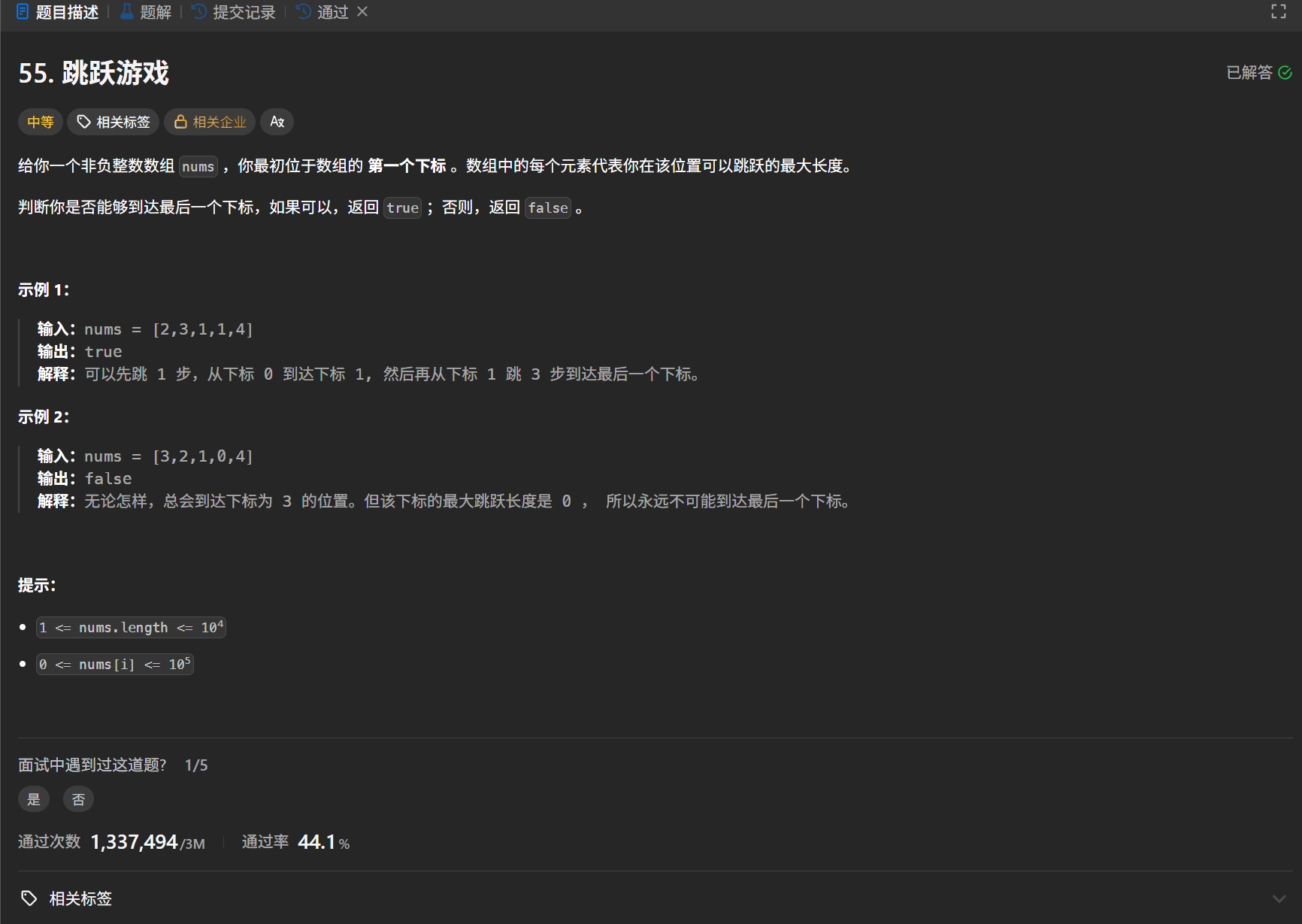 数组中的每个元素代表你在该位置可以跳跃的最大长度。