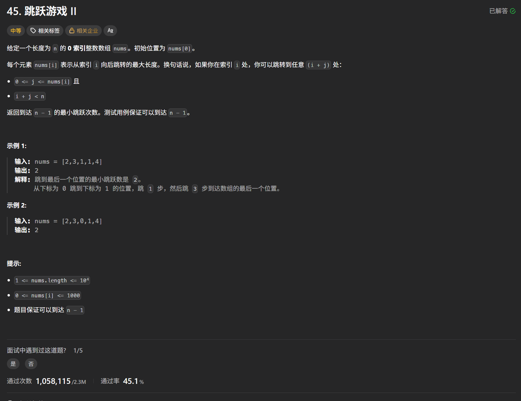 你的目标是使用最少的跳跃次数到达数组的最后一个位置。