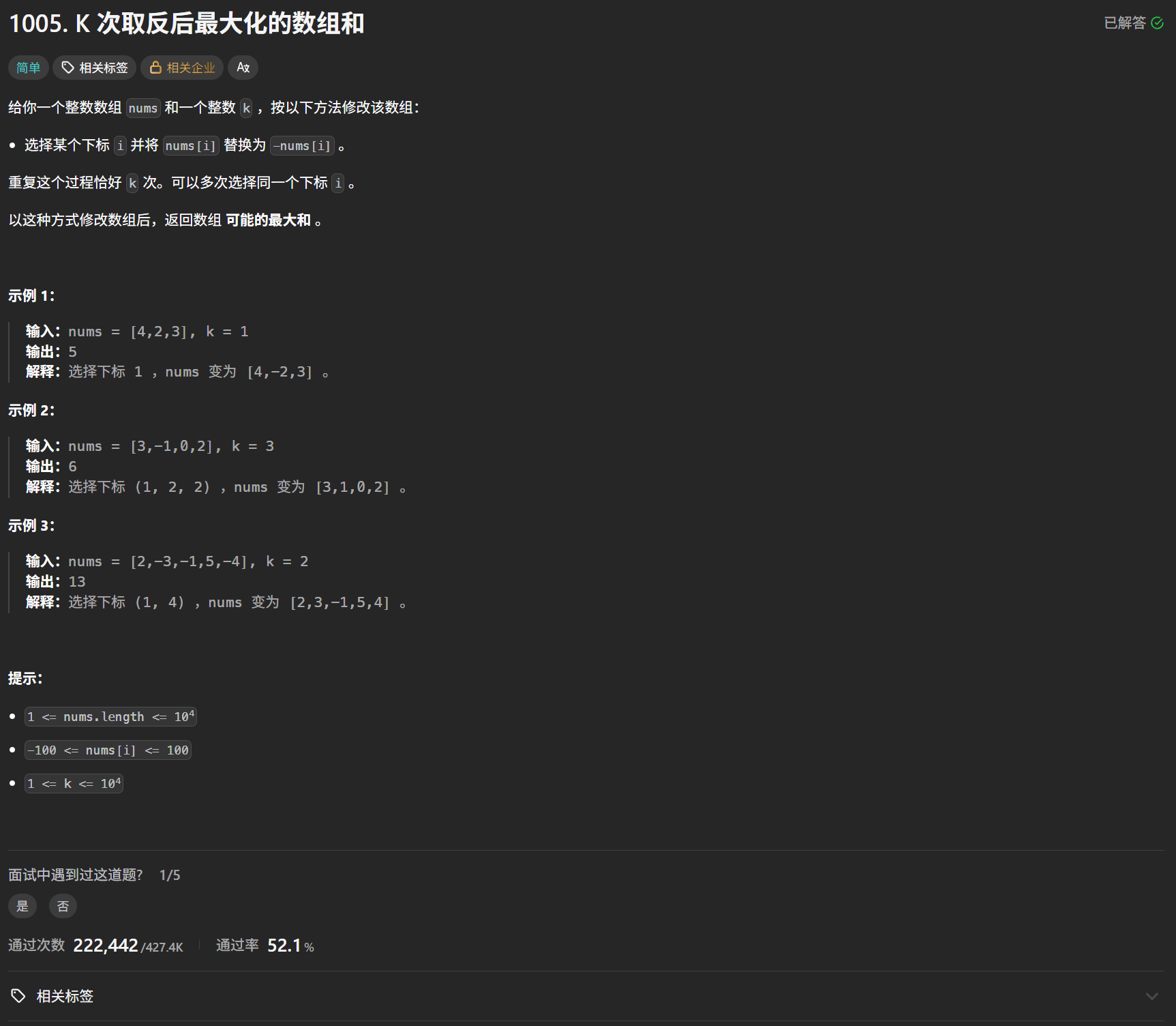 给定一个整数数组 A,我们只能用以下方法修改该数组:我们选择某个索引 i 并将 A[i] 替换为 -A[i],然后总共重复这个过程 K 次。(我们可以多次选择同一个索引 i。)