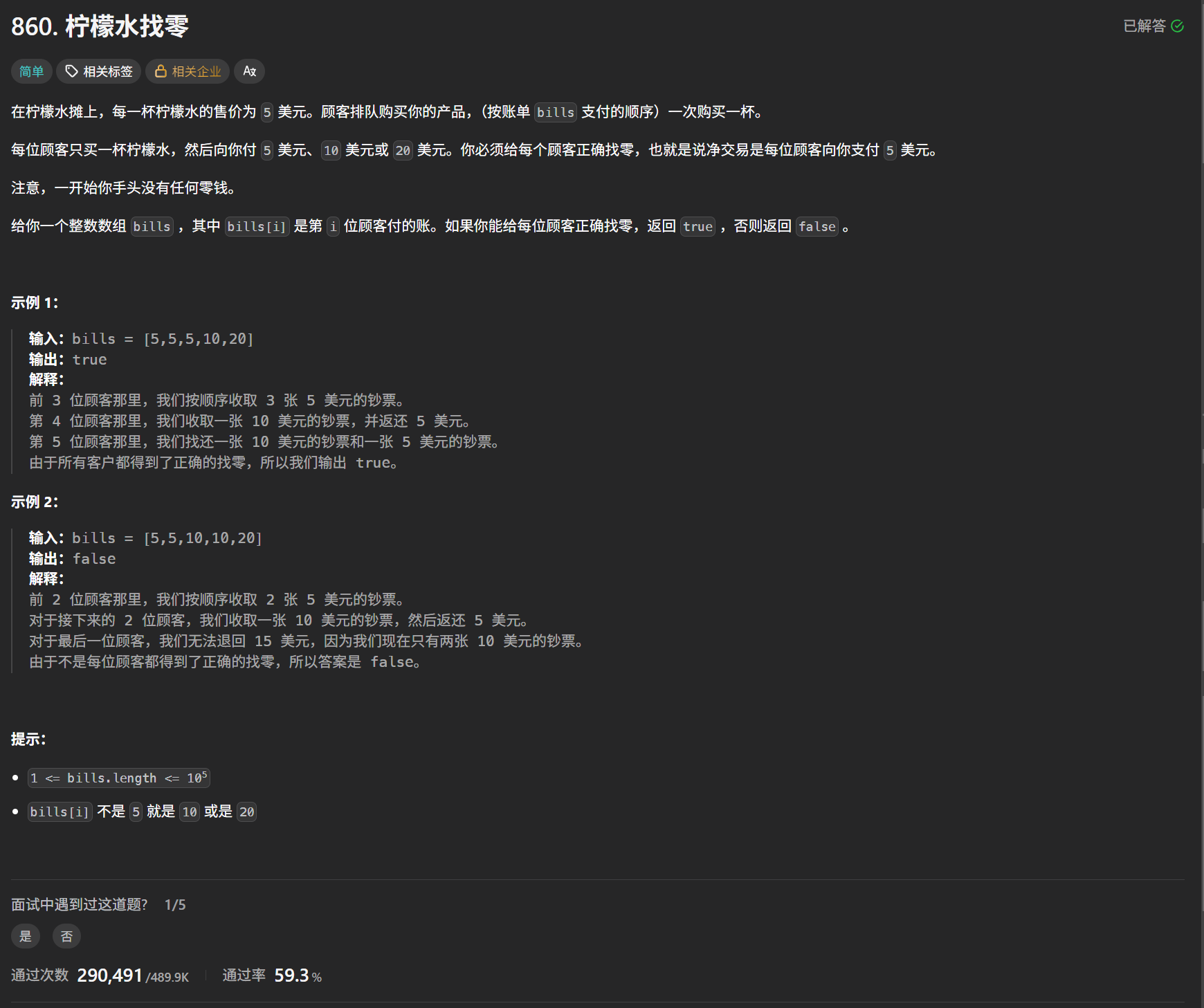 每位顾客只买一杯柠檬水,然后向你付 5 美元、10 美元或 20 美元。你必须给每个顾客正确找零,也就是说净交易是每位顾客向你支付 5 美元。