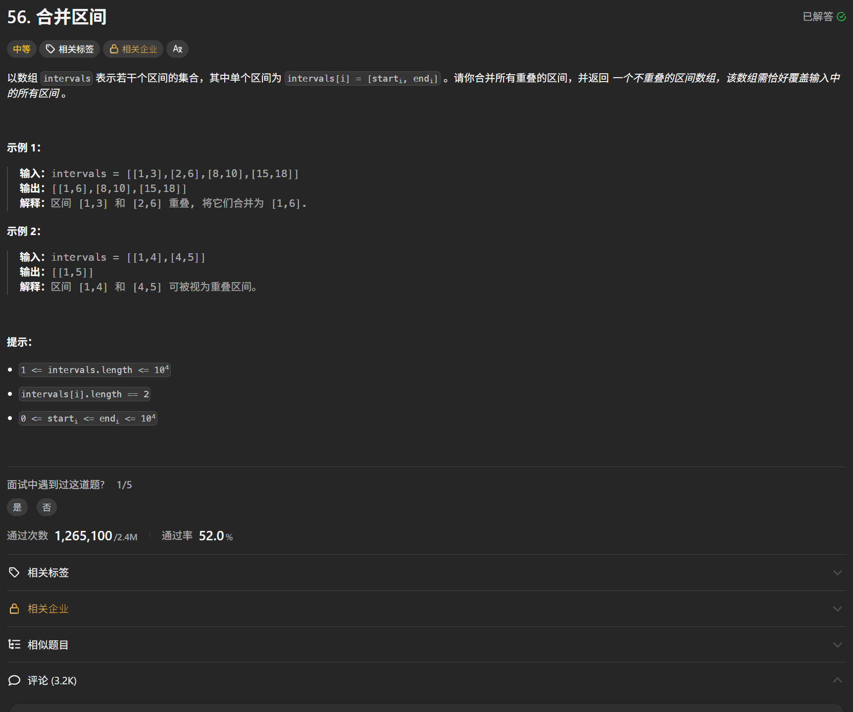 // 合并区间,只更新右边界就好,因为result.back()的左边界一定是最小值,因为我们按照左边界排序的