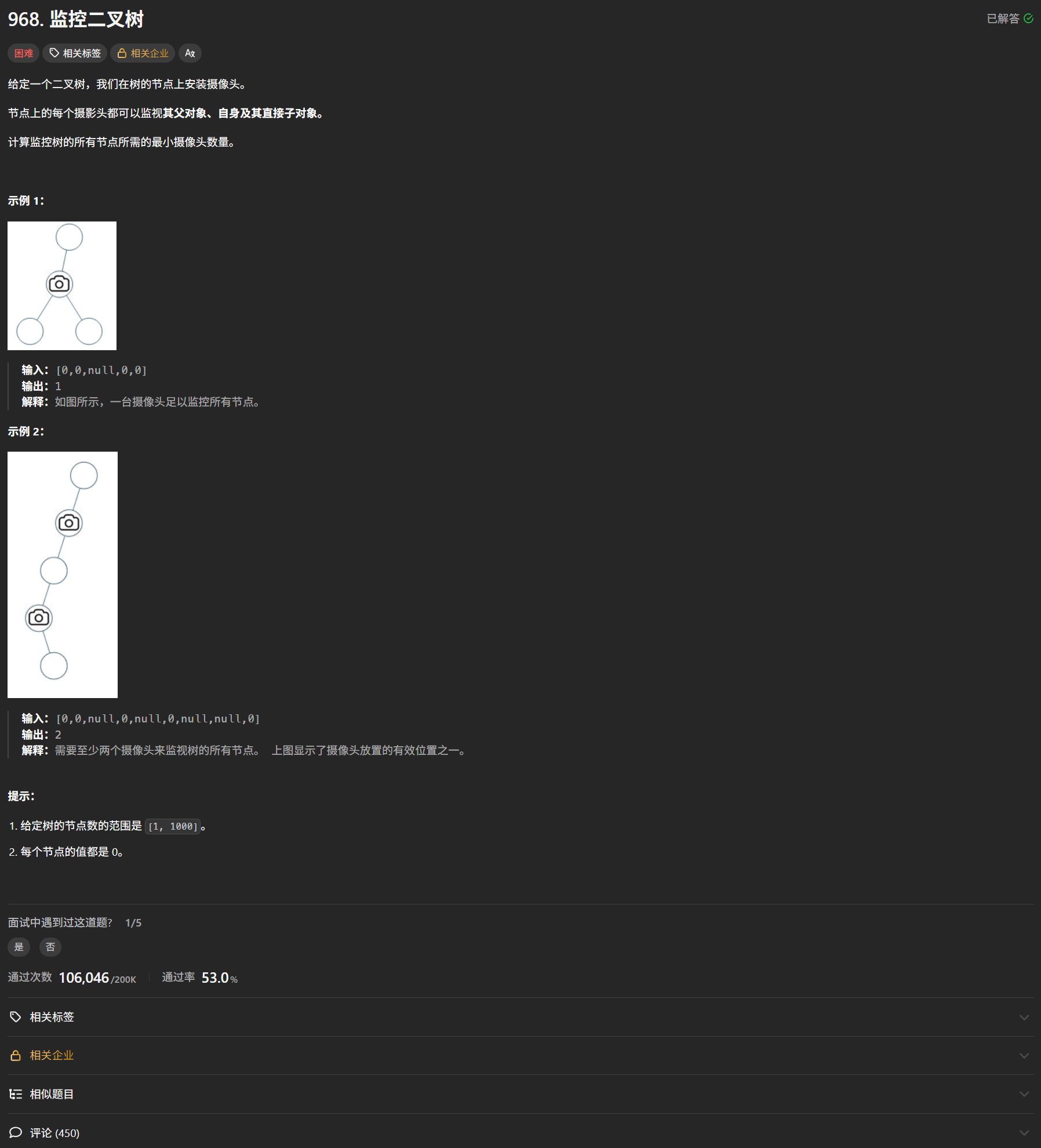 贪心思路:尽可能的将摄像头布置在叶子节点的父节点